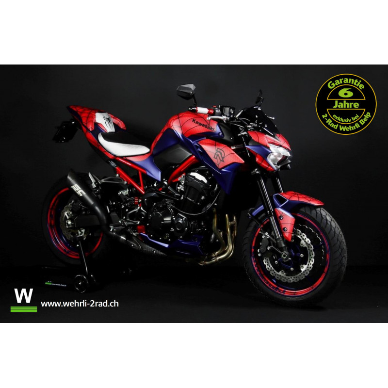 Diese Z900 ist ein Unikat im Spiderman Design (Heckumbau, Ledblinker, div. eloxierte Rizoma Teile, SC Project S1 Schalldämpfer, Echtlederelemente, Speziallackierung und Folierung).