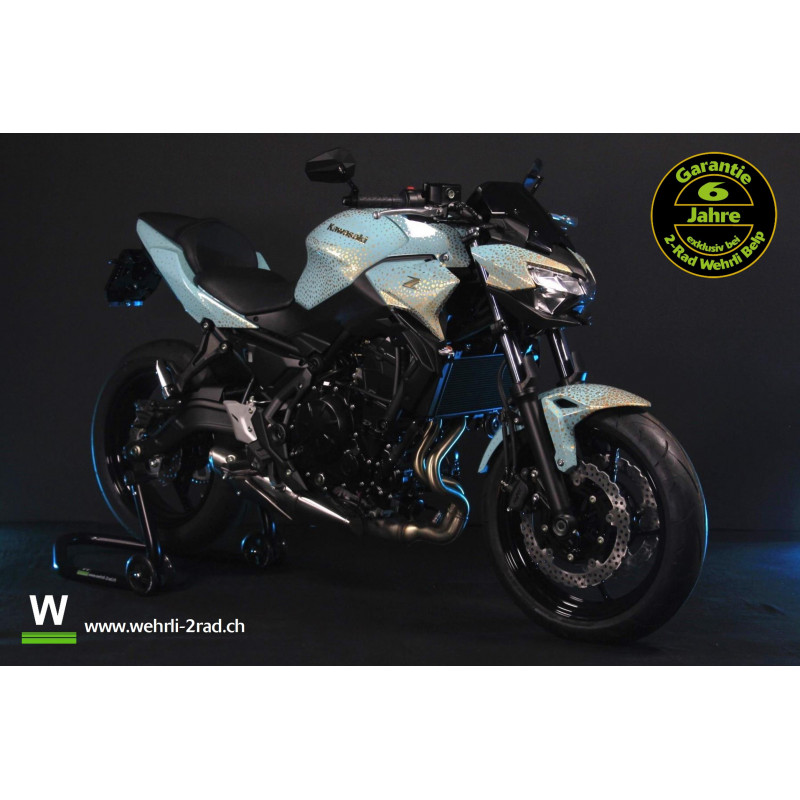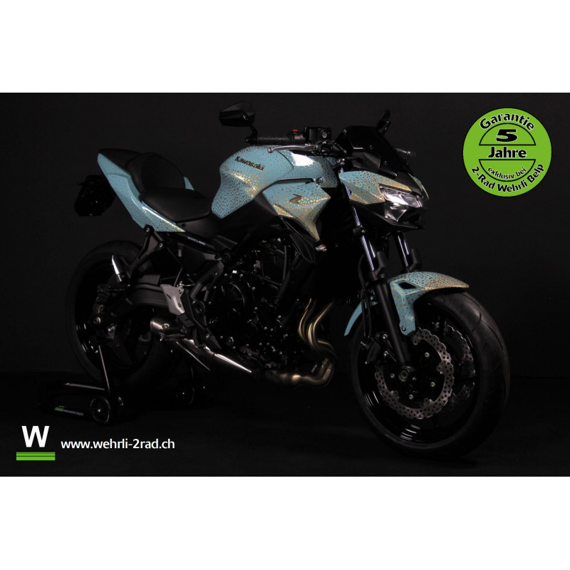 Diese Z650 wird inkl. Level 2 Performance (Heckumbau, Ledblinker, Minireflektor und Lenkerendspiegel) und einer Speziallackierung/Folierung angeboten.