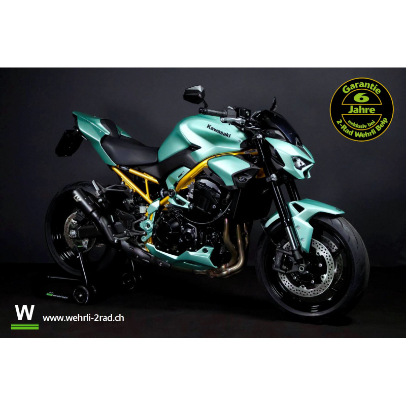 Diese Z900 ist mit unserem Level 3 Performancepaket (Kurzheck, Ledblinker, Lenkerendspiegel und Leovince Endschalldämpfer) und einer Sonderlackierung ausgestattet.